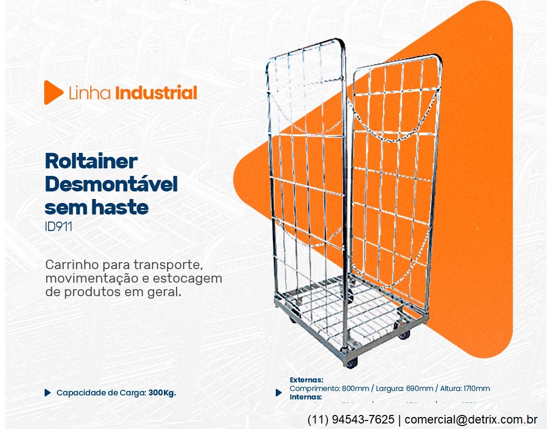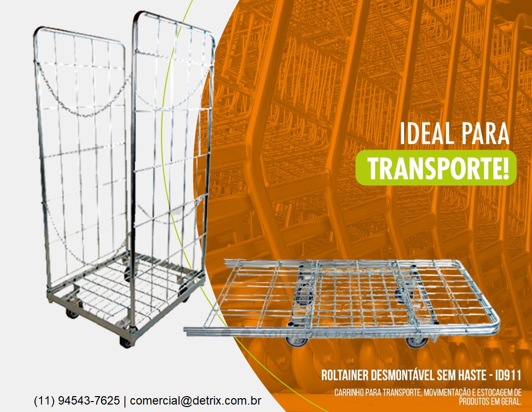 Roltainer aramado para transporte, armazenagem e picking de produtos; Utilizado como roltainer e rack aramado para transportar, transbordo de CD para lojas e movimentação de áreas internas na indústria; 2 laterais encaixadas; Fechamento com correntes para segurar mercadoria; Dobrável quando em desuso na logística reversa ou armazenagem quando vazio; Malha de fundo 50x130 mm e lateral 260x150 mm; Preço roltainer container direto da fábrica.