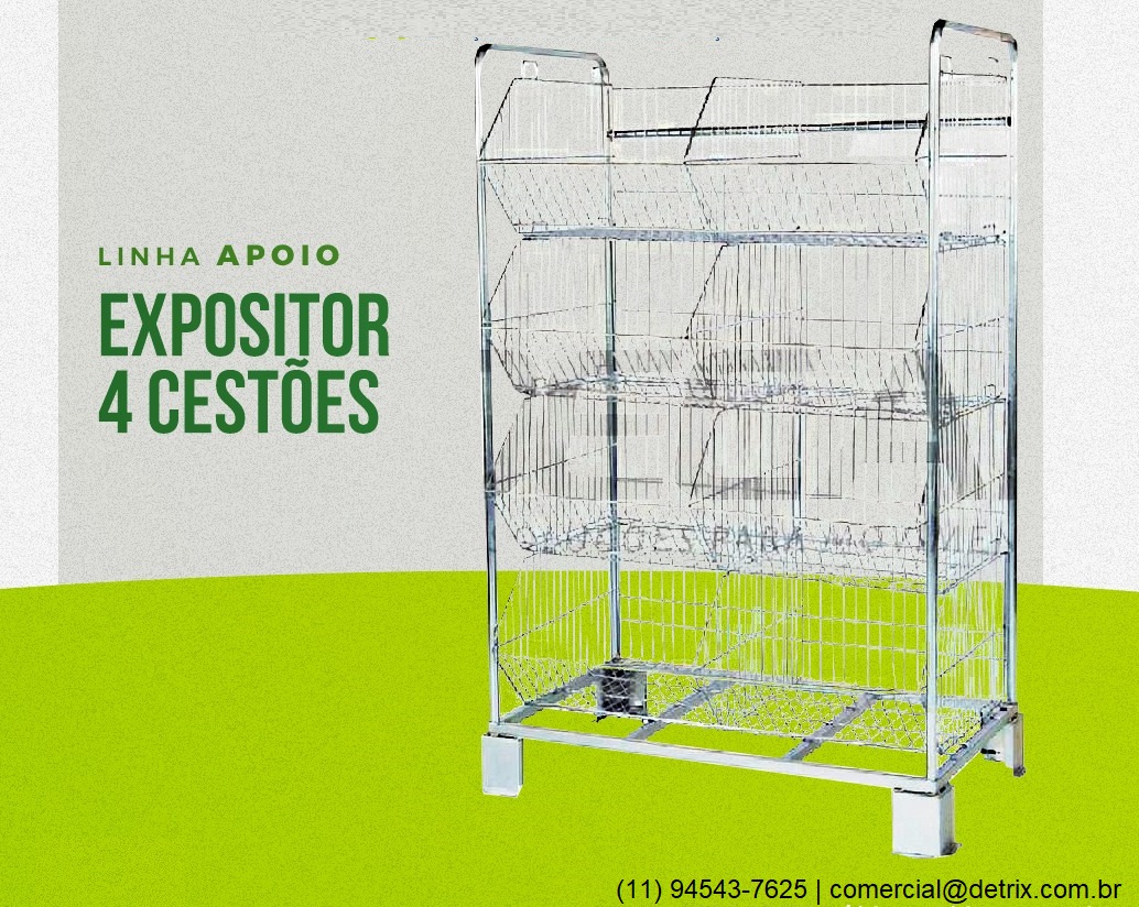 Expositor com 4 cestos aramados, para exposição de produtos em lojas, supermercado, farmácia, padaria; Utilizado com expositor de produtos promocionais, utilidades domésticas, medicamentos, material de construção e grande varejo; Estrutura em aço carbono com tela gradeada para destacar os produtos de forma estratégica no ponto de venda; Contem 4 cestas grandes de 1050x600x340 mm com divisória central que compõe oito posições de exposição ou produtos diferentes; Acabamento zincagem eletrostática; Preço de expositor de produtos direto a fábrica.