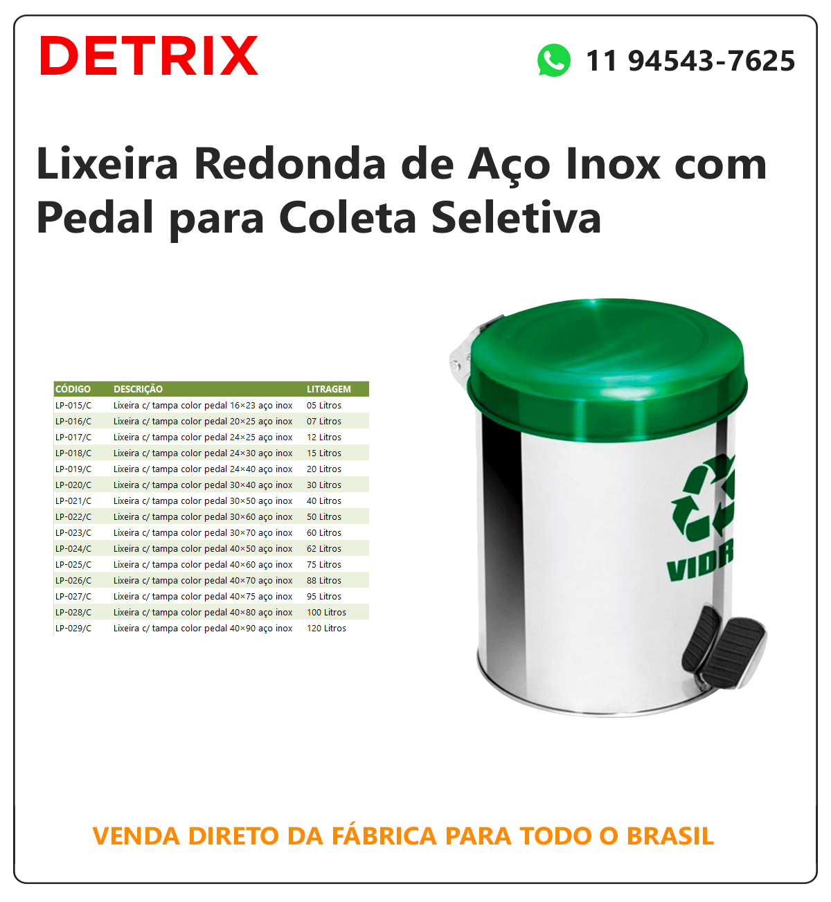 Lixeira de inox com pedal e tampa nas cores da coleta seletiva, fabricada em aço inox com a tampa acionada por pedal e encaixe para saco plástico; Utilizada como lixeira de inox com pedal e cesto de lixo de inox com pedal para coleta seletiva de lojas, hotéis, cozinhas, restaurantes, hospitais, shopping, condomínios e indústrias; Tampa azul (papel), vermelho (plástico), verde (vidro) amarelo (metal), branco (infectante), laranja (perigosos), marrom (orgânico); Preço de lixeira de inox direto da fábrica.