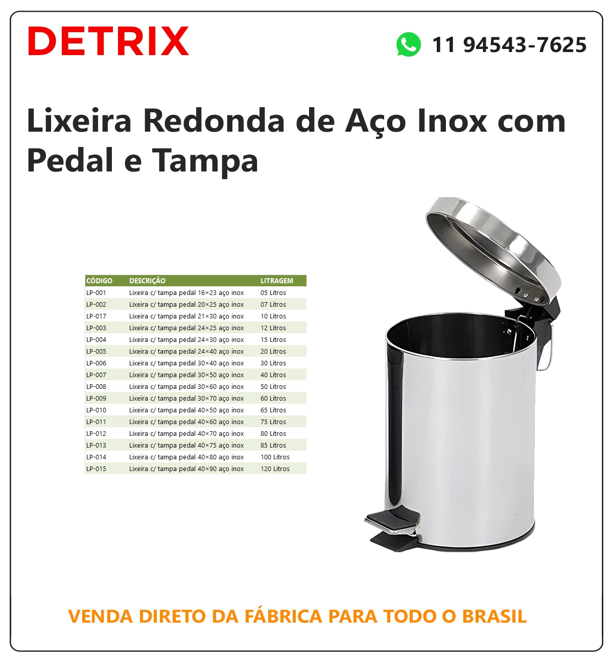 Lixeira de inox com pedal, fabricada em aço inox com a tampa acionada por pedal e encaixe para saco plástico; Utilizada como lixeira de inox com pedal e cesto de lixo de inox com pedal em áreas comuns como banheiros, cozinhas, salas e escritórios, além de ambientes empresariais e locais de alta circulação, como escolas, hospitais, hotéis, restaurantes, mercados e shopping; Preço de lixeira de inox direto da fábrica.
