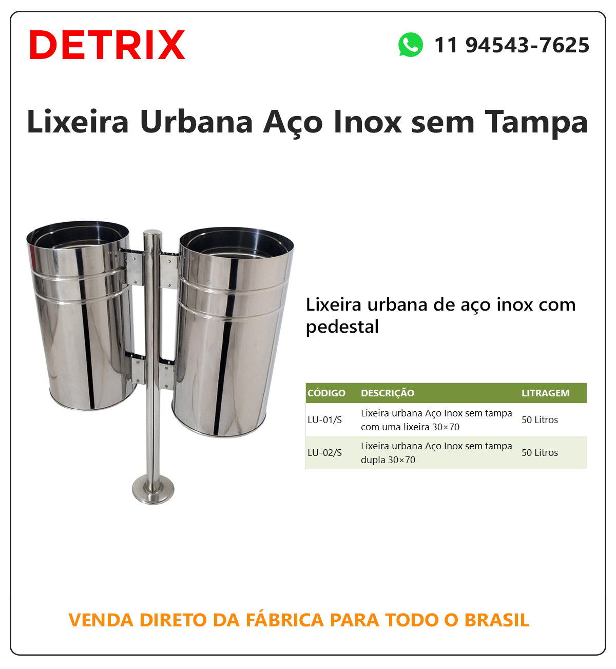 Lixeira urbana de aço inox com capacidade para 80 litros, muito resistente, com duplo pedestal. Fabricada em aço inox com estrutura tubular e base para fixar em pisos e calçadas de vias públicas, condomínios, praças, quiosques, hospitais, hotéis, shopping, indústrias e pontos de coleta de lixos e resíduos. Aro para fixar saco plástico. Venda direto da fábrica.
