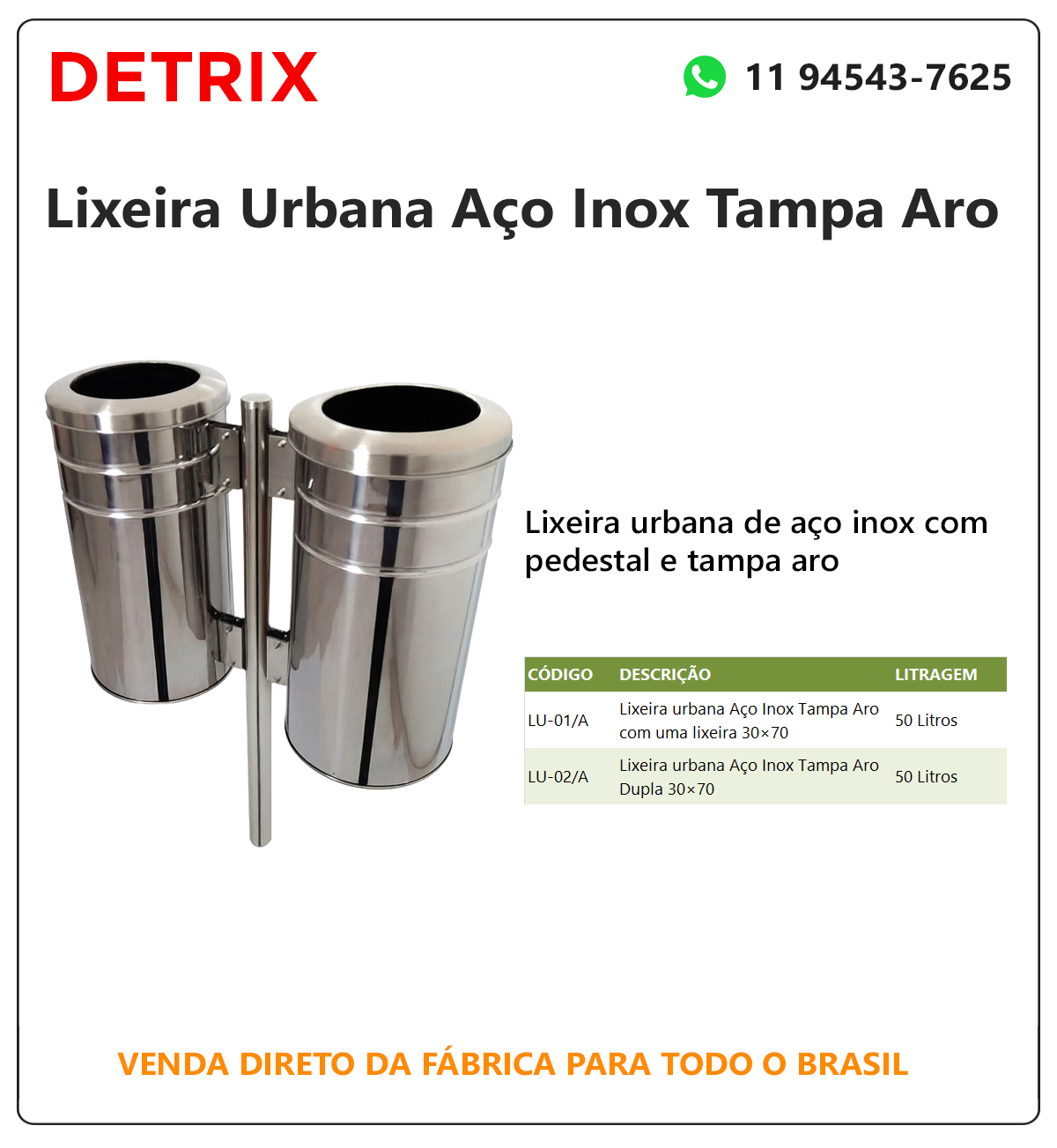 Lixeira urbana de aço inox dupla, ou simples, com pedestal, com tampa basculante. Fabricada em aço inox SAE 430 com estrutura tubular e base para fixar em pisos e calçadas de condomínios, praças, quiosques, hospitais, hotéis, shopping, indústrias e pontos de coleta de lixos e resíduos. Aro para fixar saco plástico. Venda direto da fábrica.