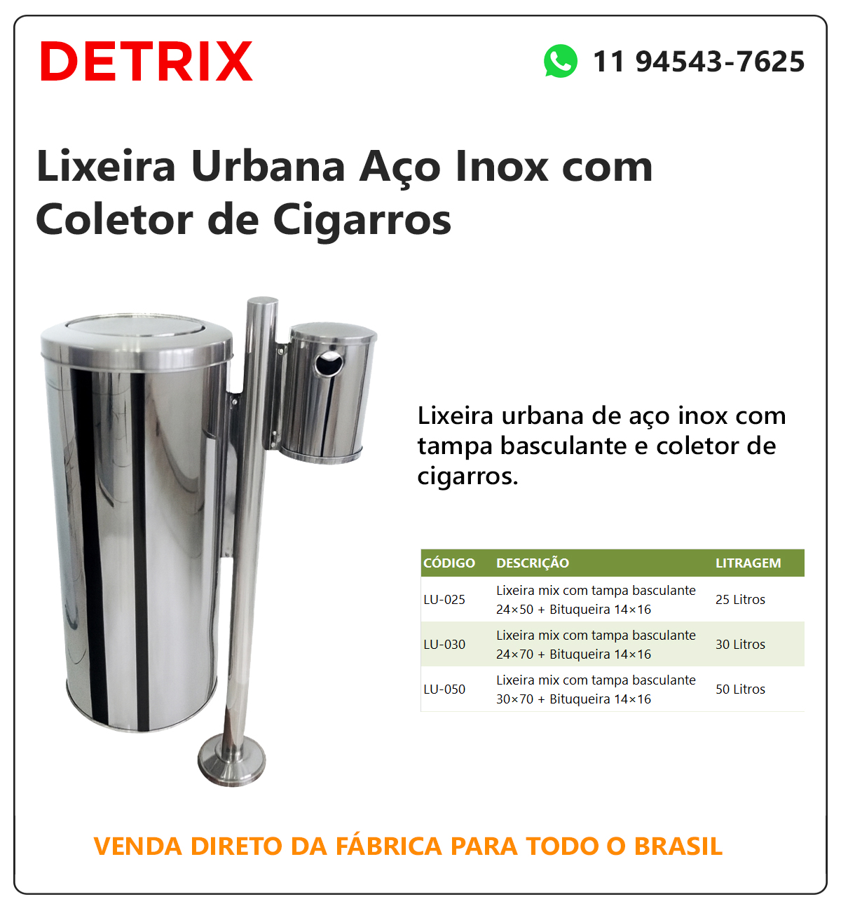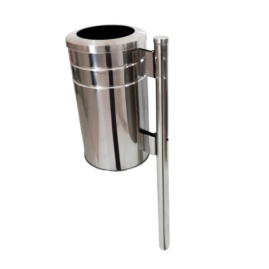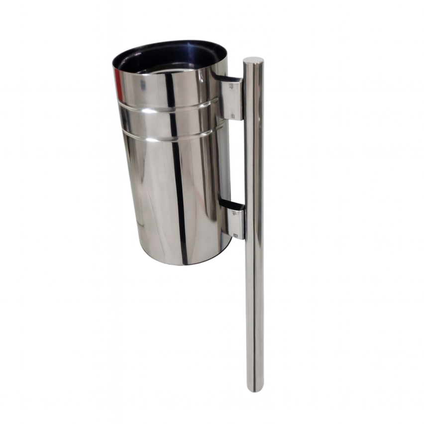 Lixeira urbana de aço inox com tampa basculante, pedestal e bituqueira para descarte de cigarros. Fabricada em aço inox com estrutura tubular e base para fixar em pisos e calçadas de vias públicas, condomínios, praças, quiosques, hospitais, hotéis, shopping, indústrias e pontos de coleta de lixos e resíduos. Aro para fixar saco plástico. Venda direto da fábrica.
