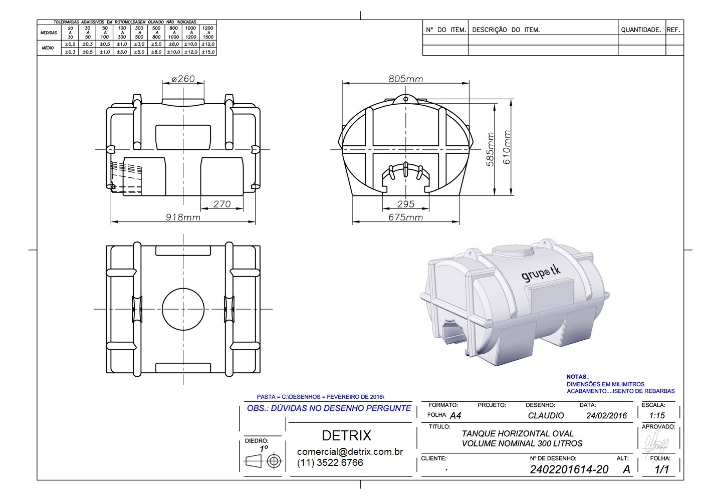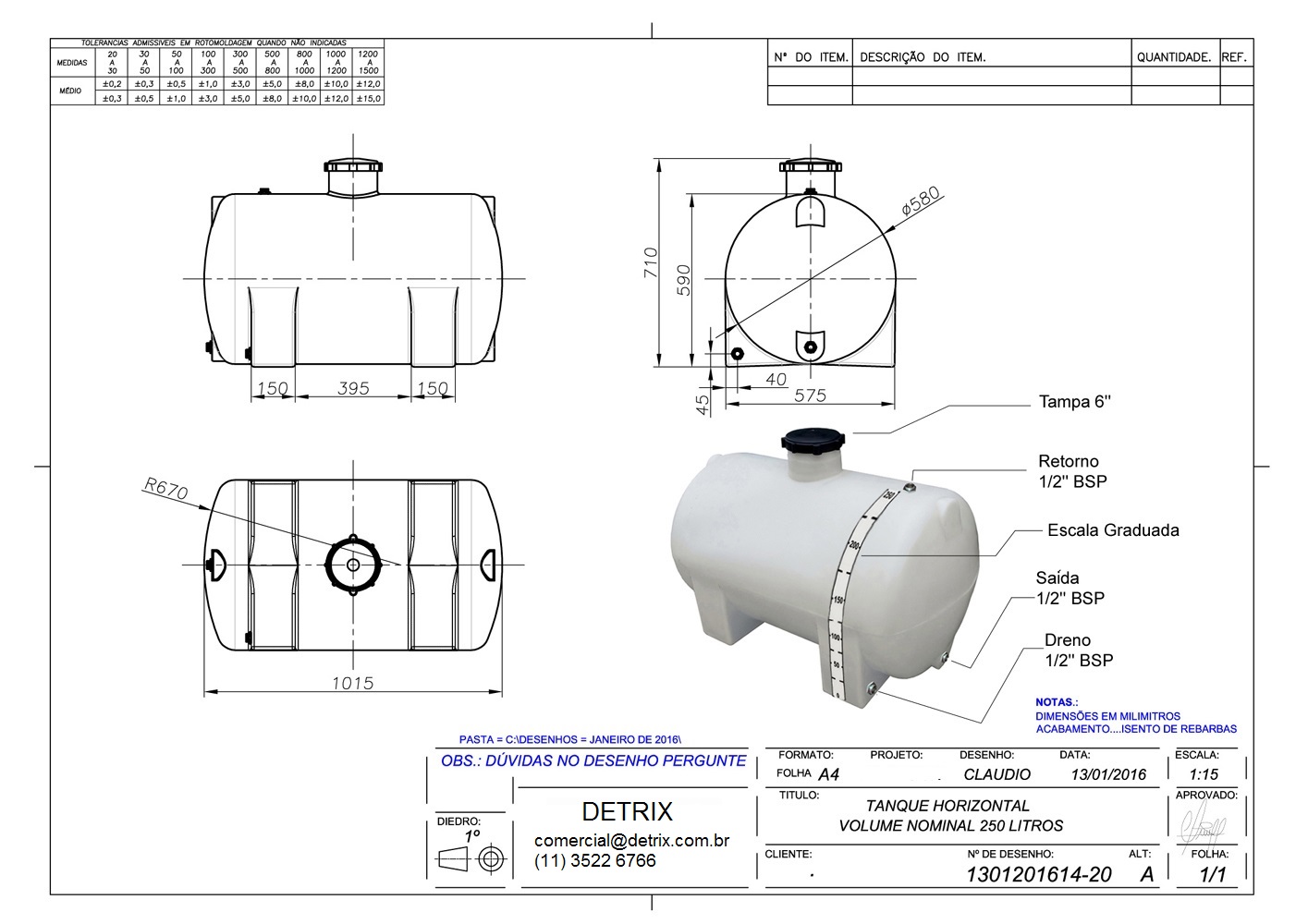 Tanque horizontal com tampa de inspeção, fabricado em polietileno rotomoldado em uma única peça sem emendas com aditivo anti-UV contra as variações climáticas (sol, chuva e poluição) em todas as cores e de alta resistência mecânica, para armazenar, dosar e transportar agua, alimentos, produtos químicos, defensivos agrícolas, combustíveis e óleos; Tampa de inspeção 260 mm; Escala graduada; Dreno 1/2 BSP; Opcional válvula de esfera em polipropileno Ø 3/4", 1", 1,5", 2" e 3" com anel de Viton ou EPDM; Preço de tanque cilíndrico direto da fábrica.