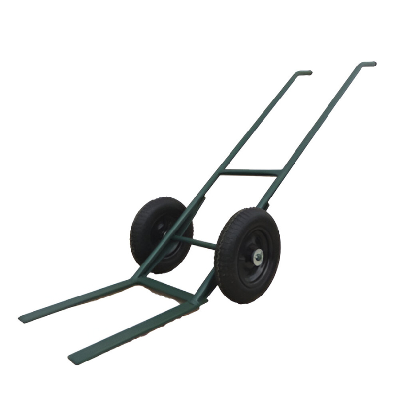 Carrinho para transporte de paletes com blocos, tijolos e materiais de construção, com capacidade de carga de até 100 kg. Fabricado em aço carbono tubular, possui 2 garfos para fácil encaixe, punhos reforçados e acabamento em pintura epóxi, nas cores verde, azul, cinza, vermelho, laranja ou preto. Equipado com 2 rodas pneumáticas com câmara para locomoção em terrenos acidentados ou regulares, como asfalto, concreto, grama e terra. Usado nas indústrias, lojas de material de construção e na construção civil para transporte de blocos de concreto e tijolos.