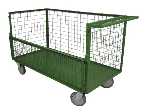 Carro caixa com assoalho de madeira, 4 abas em tela com meia porta lateral para cargas e descargas e puxador tubular; Utilizado para cargas em geral nas áreas de recebimento, produção e logística de indústria, construção civil, agricultura, frigorifico e condomínio; Estrutura em aço carbono; Pintura epóxi; Rodízios termoplástico com rolamento de esfera; Peso 40 Kg; Preço de carrinho caixa direto da fábrica.