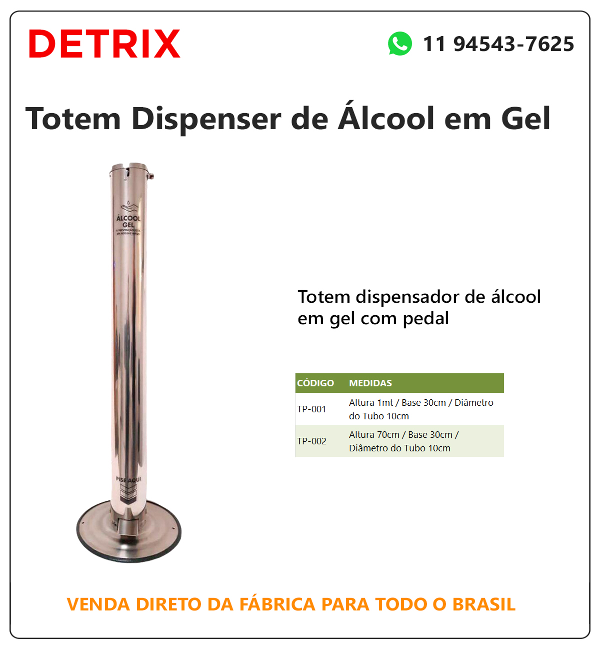 Totem de aço inox dispenser de álcool em gel com pedal para higienizar as mãos em restaurantes, hospitais, indústrias, lojas e locais públicos. Fabricado totalmente em aço inox 304 (não enferruja), com recipiente interno de 2 litros, válvula pump de acionamento com regulagem, trava de segurança com furo para cadeado, evitando retirada do recipiente sem autorização e base com 2 furos para fixar ao chão caso necessário. Basta acionar o pedal que o gel é aplicado diretamente nas mãos sem necessitar de tocar em nada após a higienização. Utilizado como dispenser de álcool em gel com pedal para higienizar as mãos em restaurantes, hospitais, indústrias, lojas e locais públicos.