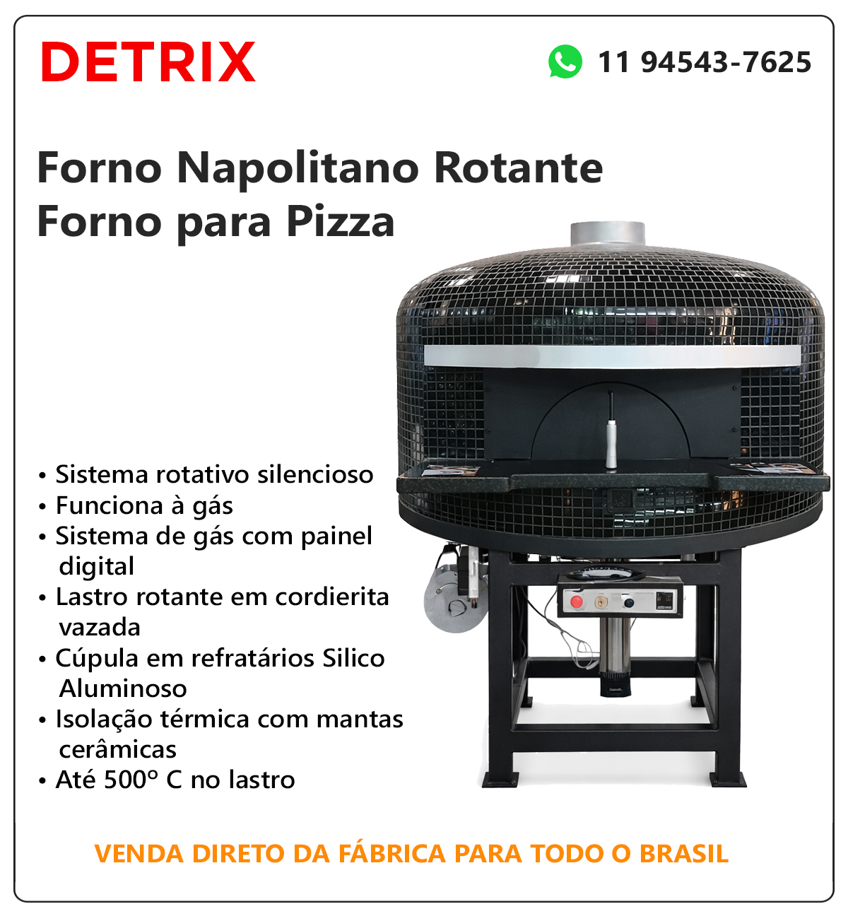 Autêntico Forno Napolitano fabricado com materiais de alta qualidade, com lastro rotante, painel digital e funcionamento à gás. Desenvolvido para pizzarias, restaurantes e cozinhas profissionais que buscam autenticidade, eficiência térmica e alta produtividade. Inspirado nos tradicionais fornos italianos, ele proporciona assamento rápido, uniforme e com o sabor característico da verdadeira pizza napolitana. O lastro rotante proporciona assamento mais uniforme, maior produtividade, padronização do resultado e melhor aproveitamento do calor, sem necessidade de girar a pizza manualmente. Com engenharia térmica avançada, o forno mantém temperaturas elevadas de forma estável, atingindo até 500º C no lastro. Ideal para pizzarias, restaurantes, padarias, bares, cozinhas industriais e até residências. Utilizado principalmente para pizzas, mas pode assar e gratinar diversos outros tipos de pratos e alimentos, como carnes, legumes, massas e pães.