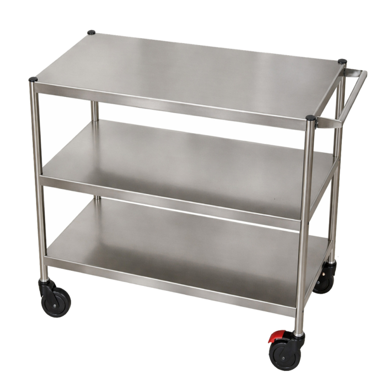 Carro bandeja com 3 planos, fabricado em aço inox com estrutura em cantoneira e tampos com superfície lisa em chapa de aço inox reforçado de fácil higienização. Equipado com empurrador frontal ergonômico e 4 rodízios de Ø 4”, sendo 2 fixos e 2 giratórios com freios para fácil movimentação em pisos, corredores e elevadores. Utilizado como carro auxiliar com 1 plano para transportar e acondicionar alimentos e utensílios nas áreas de higienização, preparo, distribuição e cocção em cozinhas de restaurantes, churrascarias, hotéis, hospitais, frigoríficos.