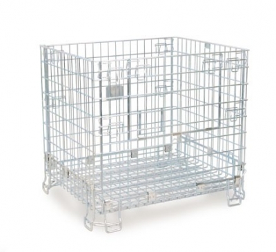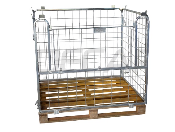 Rack container aramado dobrável e empilhável para paletes de madeira, utilizado para condicionar e movimentar peças e produtos em paleteiras e empilhadeiras em indústrias, lojas e supermercados; Estrutura aramada para identificar objetos no seu interior; Aplicável em palete PBR (1200x1000 mm); Porta etiqueta; Portinhola frontal; Acabamento zincado; Não acompanha o palete de madeira.