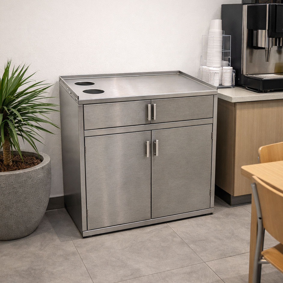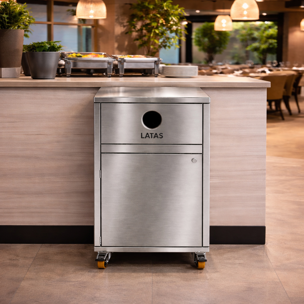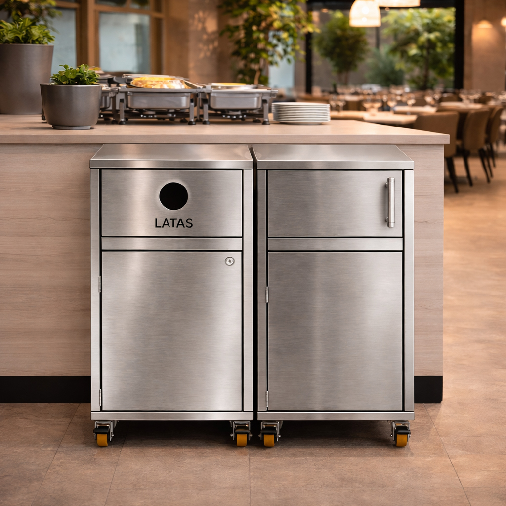 Lixeira fast food para a coleta de latas de bebidas e garrafas descartáveis. Fabricada em aço inox acabamento escovado com furo frontal de Ø 90 mm para o descarte organizado de latas de bebidas, garrafas de água e garrafas long neck. Conta com porta frontal com puxador e cesto plástico interno com capacidade de 100 Litros. Utilizada em conjunto com a lixeira fast food com porta basculante para resíduos orgânicos e descartáveis e com o porta-bandejas food. É ideal para uso em cafés, lojas de fast food, padarias, lanchonetes, restaurantes, shoppings, refeitórios e praças de alimentação, promovendo o descarte o organizado de resíduos, embalagens, copos plásticos, latas, garrafas e lixo orgânico.