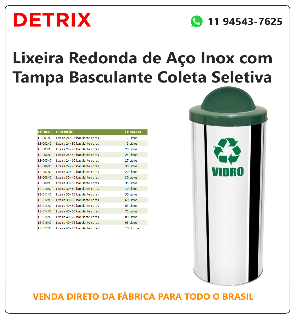 Lixeira de inox tampa basculante nas cores da coleta seletiva, fabricada em aço inox com tampa basculante e encaixe para saco plástico; Utilizada como lixeira de inox tampa basculante vai e vem colorida em pontos de coleta seletiva de lojas, hotéis, cozinhas, restaurantes, hospitais, shopping, condomínios e indústrias; Tampa azul (papel), vermelho (plástico), verde (vidro) amarelo (metal), branco (infectante), laranja (perigosos), marrom (orgânico); Preço de lixeira de inox direto da fábrica.