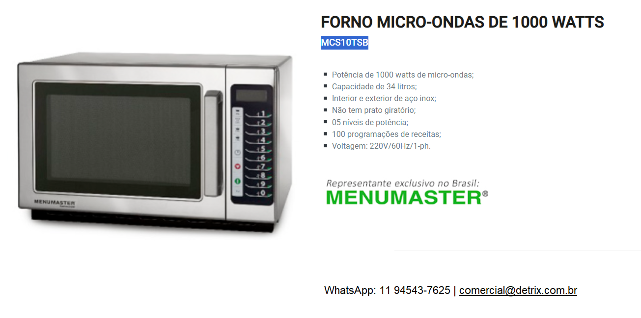 Micro-ondas industrial Menumaster MCS10TSB é o micro-ondas de uso industrial mais vendido no Brasil; Fabricado em aço inox com 1000w de potência, timer de contagem regressiva e painel com 10 teclas programáveis para 100 memórias; Suas principais características comparadas ao equipamento da linha branca são robustez, velocidade, padronização e alta durabilidade; O que determina a vida útil de um micro-ondas são as horas de funcionamento do seu magnéton; O magnéton do MCS10TSB tem 2000 horas de vida útil, sendo 10 vezes mais resistente do que o microondas de linha branca que possui em média 200 horas de vida útil.
