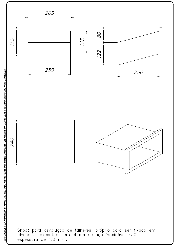 O Shoot para Talheres é a solução ideal para organizar e agilizar a devolução de utensílios em cozinhas profissionais e refeitórios. Fabricado em aço inox com acabamento escovado e fácil higienização. Possui inclinação permitindo o deslize suave dos talheres até a área de coleta, para remolho e higienização.