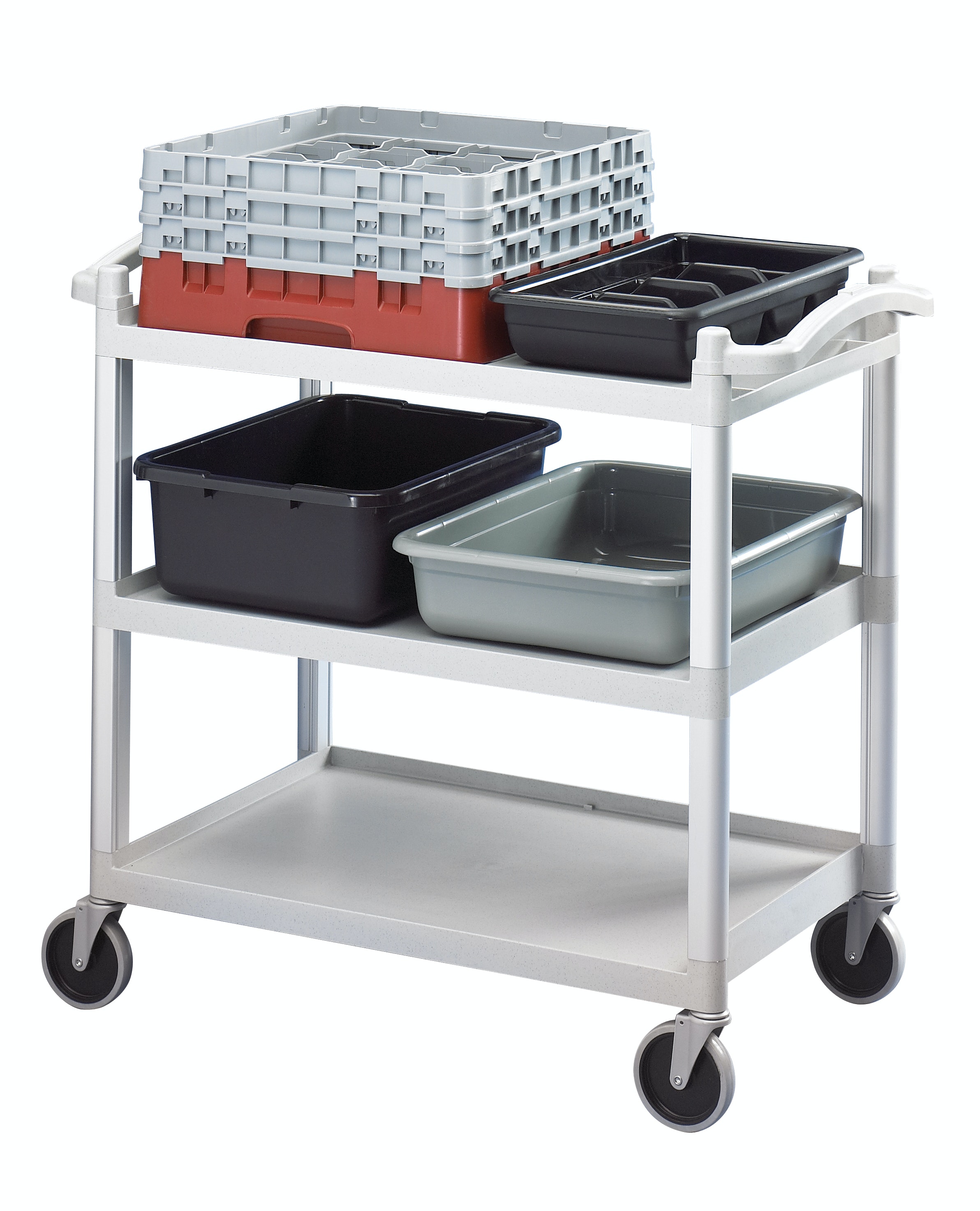 Carro utilitário Cambro triplex, produzido em polipropileno com estrutura em tubo de alumínio anodizado; Utilizado em cozinhas industriais e restaurantes de hotéis, hospitais e industrias no transporte de bandejas, pratos, talheres, toalhas, itens de limpeza e lavanderia; 2 puxadores; Rodas de 4" giratórias que facilitam o deslocamento em corredores e elevadores; Cor preto ou cinza; Fornecido com ou sem porta talheres de 9,5 Litros e recipiente de lixo de 30 Litros; Preço de carro bandeja Cambro direto do distribuidor.