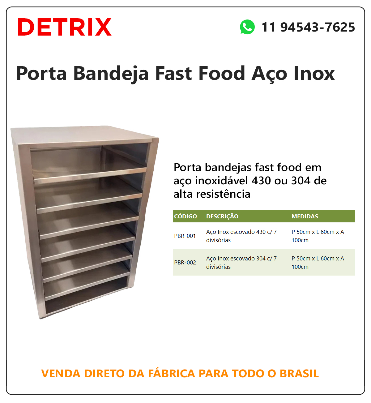 As bandejas cumprem um papel imprescindível na movimentação dos pedidos até as mesas, de modo seguro, higiênico e eficaz; O porta bandejas fast food, facilita e agiliza a organização do local, pois permite recolher e empilhar as bandejas de maneira compacta higiênica e segura em praças de alimentação, restaurantes e refeitórios.