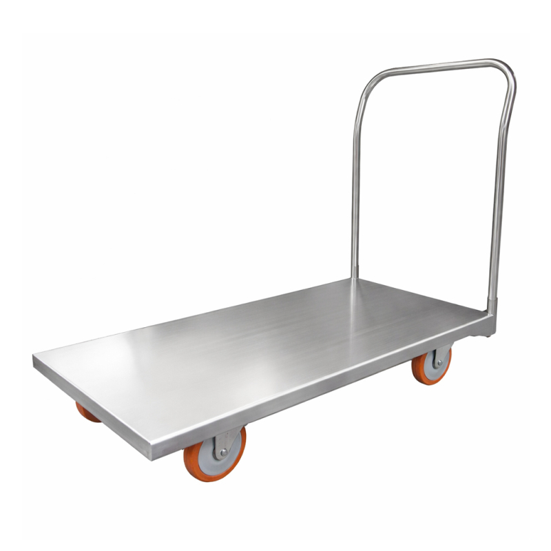 Carrinho plataforma em aço inox com aba tubular, para movimentação de alimentos e produtos em geral em locais úmidos e molhados, ou que necessitam de alta proteção contra a oxidação. Capacidade de carga de até 400 Kg, equipado com 4 rodízios de aço zincados de 4″, sendo 2 fixos e 2 giratórios. Estrutura totalmente em aço inoxidável, com acabamento fosco ou espelhado, que não sofre oxidação e é de fácil higienização. Utilizado para transportar alimentos e produtos em geral em locais úmidos e molhados ou que necessitam de alta proteção a oxidação, em indústrias químicas, farmacêuticas e alimentícias, frigoríficos, regiões marítimas, caminhões frigoríficos, câmaras frias e cozinhas profissionais.