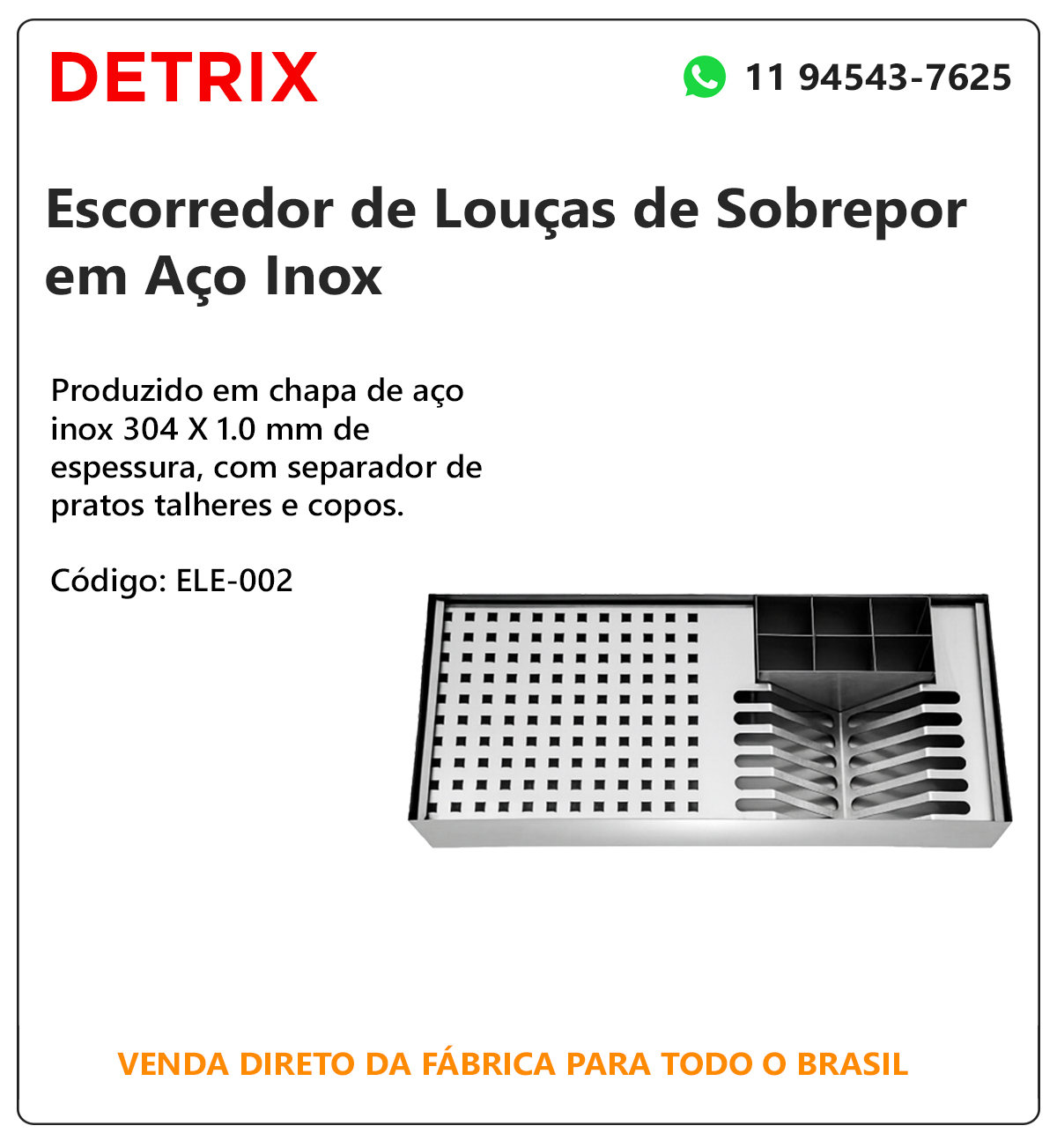 Escorredor para louças de sobrepor, produzido totalmente em aço inox 304 com espessura de 1mm, o que o torna extremamente resistente, durável e higiênico, além de muito bonito. Possui separador de pratos, talheres e copos. Ideal para quem procura soluções funcionais para cozinhas e áreas gourmet com um toque de inovação e sofisticação. Utilizada como escorredor de louças de sobrepor em cozinhas profissionais, cozinhas de restaurantes e hotéis. Acompanha válvula. Preço do escorredor de louças em aço inox direto da fábrica.