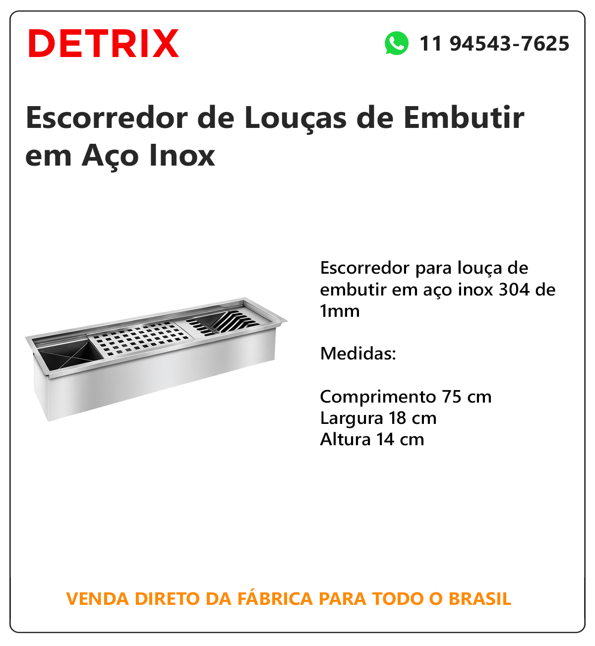 Escorredor para louças de embutir, produzido totalmente em aço inox 304 com espessura de 1mm, o que o torna extremamente resistente, durável e higiênico, além de muito bonito. Possui separador de pratos, talheres e copos. Ideal para quem procura soluções funcionais para cozinhas e áreas gourmet com um toque de inovação e sofisticação. Utilizada como escorredor de louças embutido em cozinhas profissionais, cozinhas de restaurantes e hotéis. Acompanha válvula. Preço do escorredor de louças em aço inox direto da fábrica.
