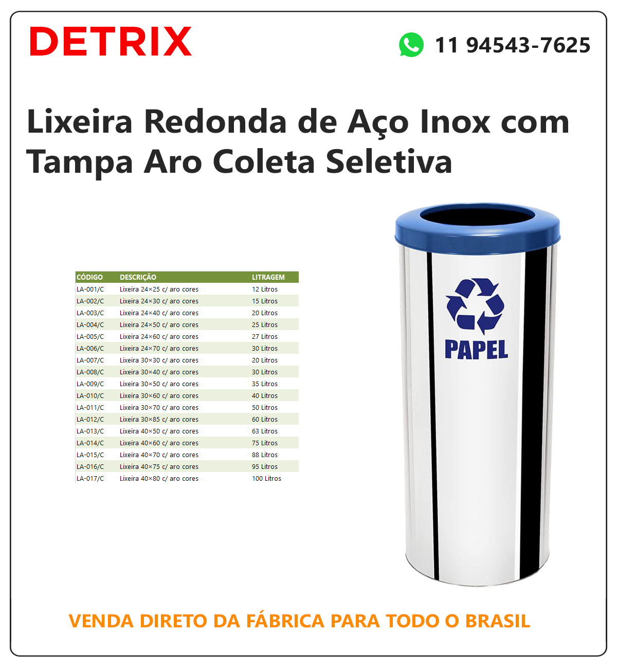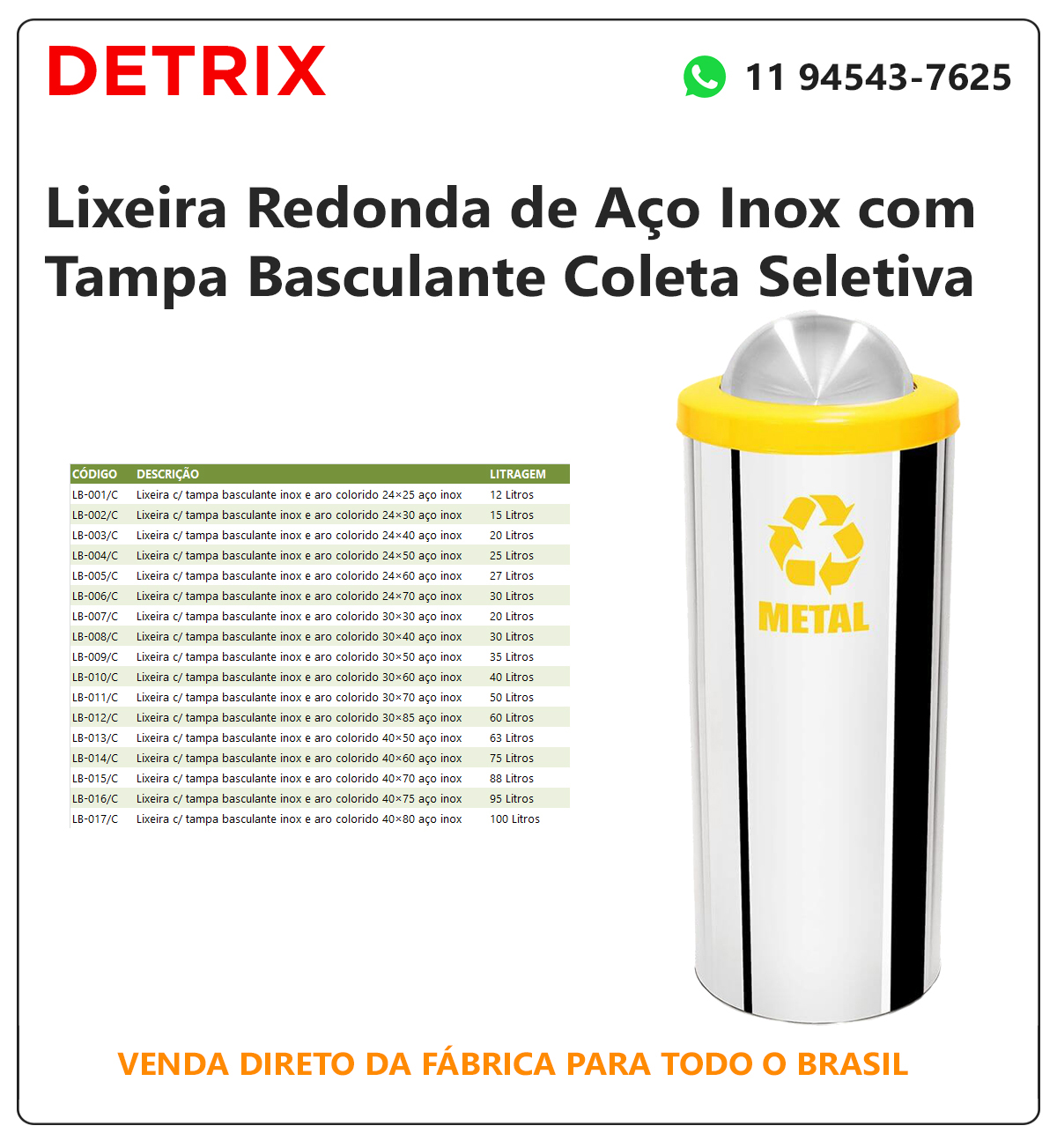Lixeira de inox tampa basculante e aro nas cores da coleta seletiva, fabricada em aço inox com tampa basculante e encaixe para saco plástico. Tampa azul (papel), vermelho (plástico), verde (vidro) amarelo (metal), branco (infectante), laranja (perigosos), marrom (orgânico). Utilizada como lixeira de inox tampa basculante vai e vem colorida em pontos de coleta seletiva de lojas, hotéis, cozinhas, restaurantes, hospitais, shopping, condomínios e indústrias. Preço de lixeira de inox direto da fábrica.