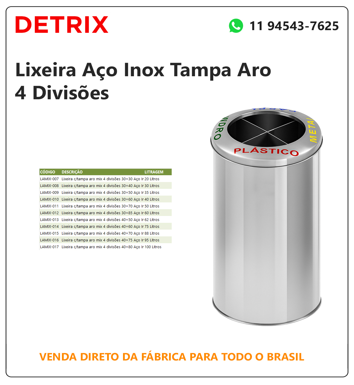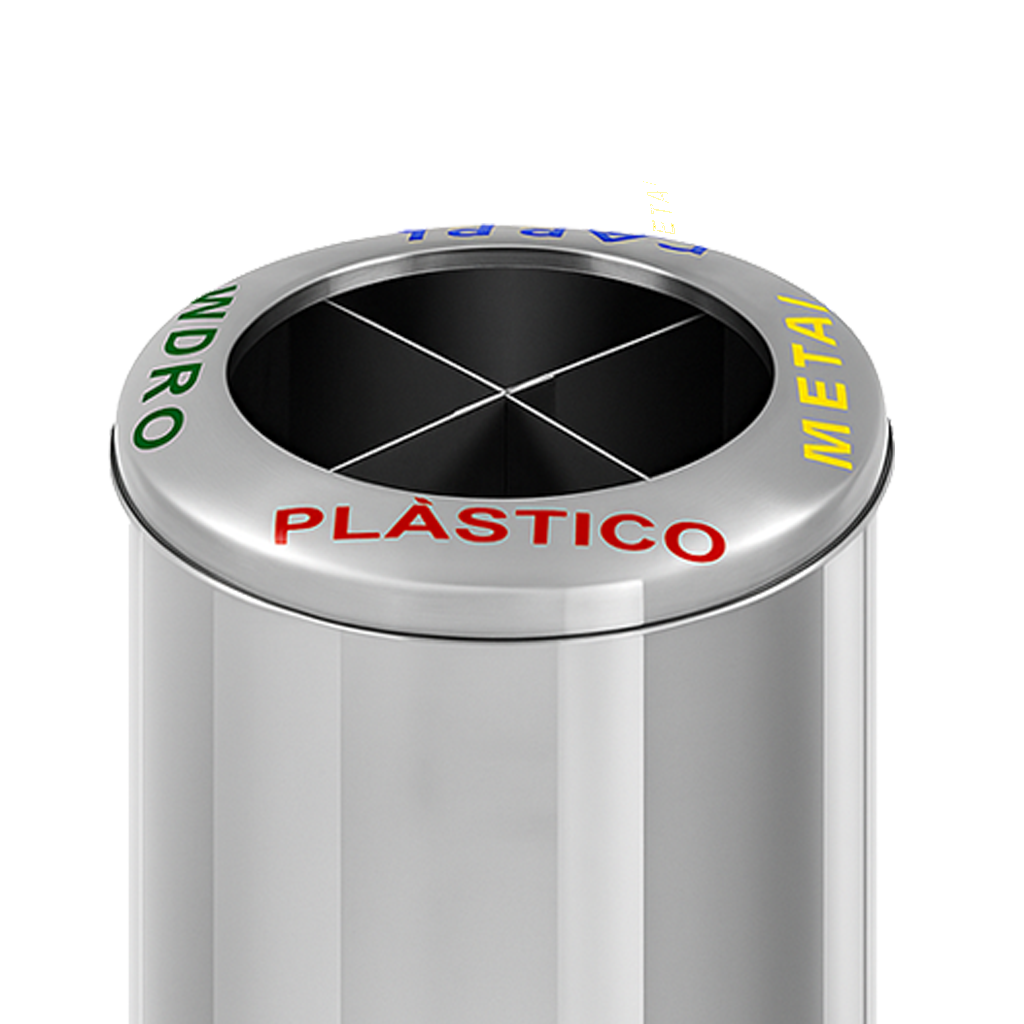 Lixeira redonda de inox com tampa aro com 4 divisões para coleta seletiva, fabricada em aço inox com encaixe para saco plástico. Utilizada como lixeira de inox com divisões para coleta de resíduos em pontos de coleta seletiva de lojas, hotéis, cozinhas, restaurantes, hospitais, shopping, condomínios e indústrias. Preço de lixeira de inox direto da fábrica.