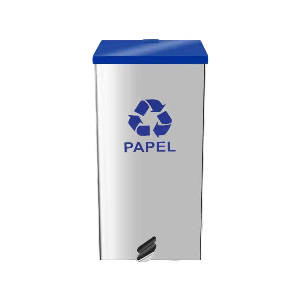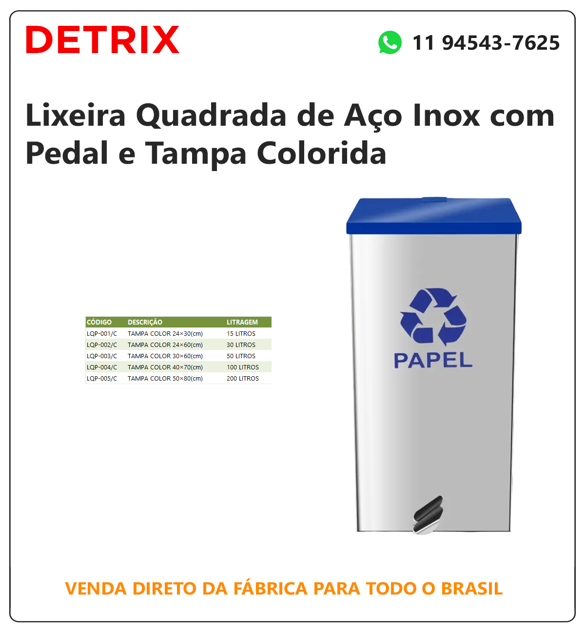 Lixeira de inox quadrada com pedal e tampa colorida nas cores da coleta seletiva, fabricada em aço inox com a tampa acionada por pedal e encaixe para saco plástico. Lixeira de inox com tampa colorida: azul (papel), vermelho (plástico), verde (vidro) amarelo (metal), branco (infectante), laranja (perigosos), marrom (orgânico). Utilizada como lixeira de inox quadrada com pedal e como cesto de lixo quadrado de inox com pedal e tampa colorida para coleta seletiva de hotéis, cozinhas, restaurantes, hospitais, shopping, condomínios e indústrias. Venda direto da fábrica para todo Brasil.