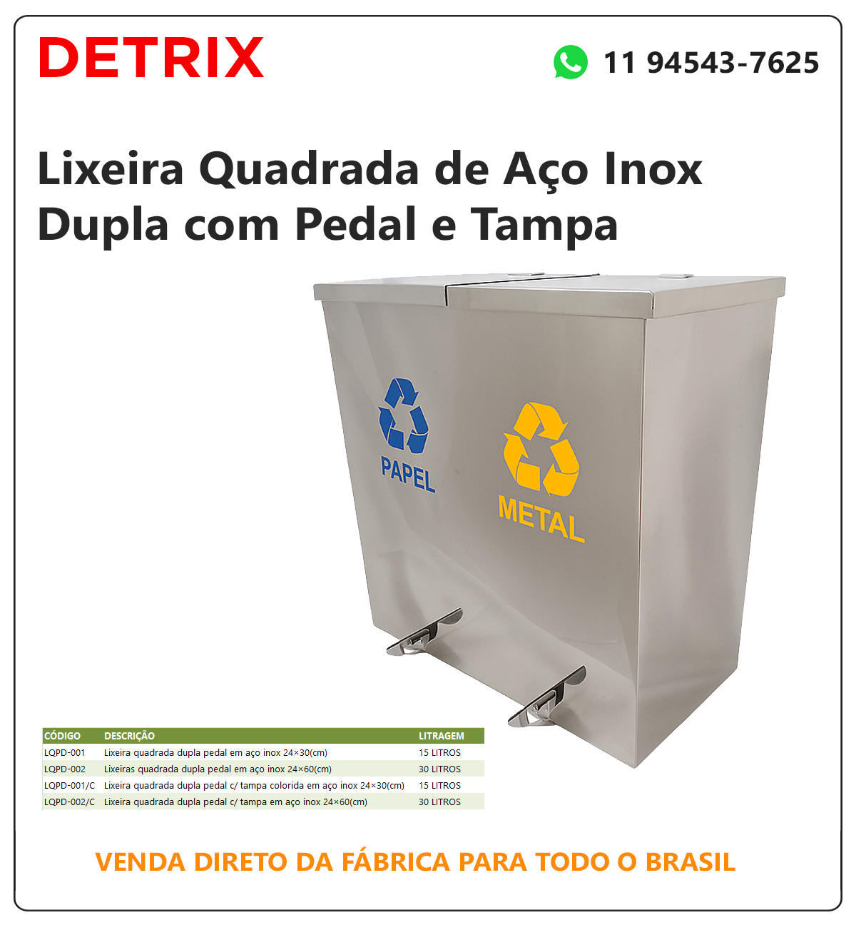 Lixeira de aço inox quadrada dupla com pedal de abertura da tampa, fabricada em aço inox com encaixe para saco plástico. Pode ser fornecida como lixeira com tampa colorida nas cores da coleta seletiva ou com adesivos da coleta seletiva. Utilizada como lixeira de aço inox dupla com pedal de acionamento da tampa para coleta seletiva de lixos e resíduos em restaurantes, cozinhas profissionais, praça de alimentação, refeitórios, hospitais, shopping, lojas, hotéis, condomínios e indústrias. Lixeira de inox com tampa colorida: azul (papel), vermelho (plástico), verde (vidro) amarelo (metal), branco (infectante), laranja (perigosos), marrom (orgânico). Venda direto da fábrica para todo Brasil.