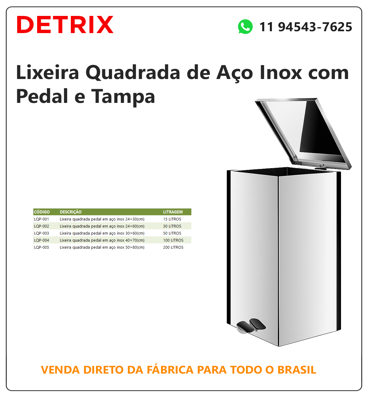Lixeira de inox quadrada com pedal de abertura da tampa, fabricada em aço inox com a tampa acionada por pedal e encaixe para saco plástico; Utilizada como lixeira de inox quadrada com pedal e cesto de lixo quadrado de inox com pedal em áreas comuns como banheiros, cozinhas, salas e escritórios, além de ambientes empresariais e locais de alta circulação, como escolas, hospitais, hotéis, restaurantes, mercados e shopping; Preço de lixeira de inox direto da fábrica.