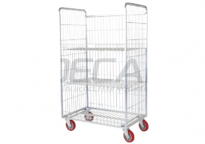 Carrinho expositor aramado para produtos diversos no ponto de vedas de lojas, supermercado, padaria, confeitaria e para acondicionar produtos, peças e componentes na indústria, fabricado em estrutura metálica com forração aramada de proteção nas laterais e traseira com 2 prateleiras fixas acopladas; Acabamento zincagem eletrostática; Preço de carrinho expositor de produtos em geral direto da fábrica.