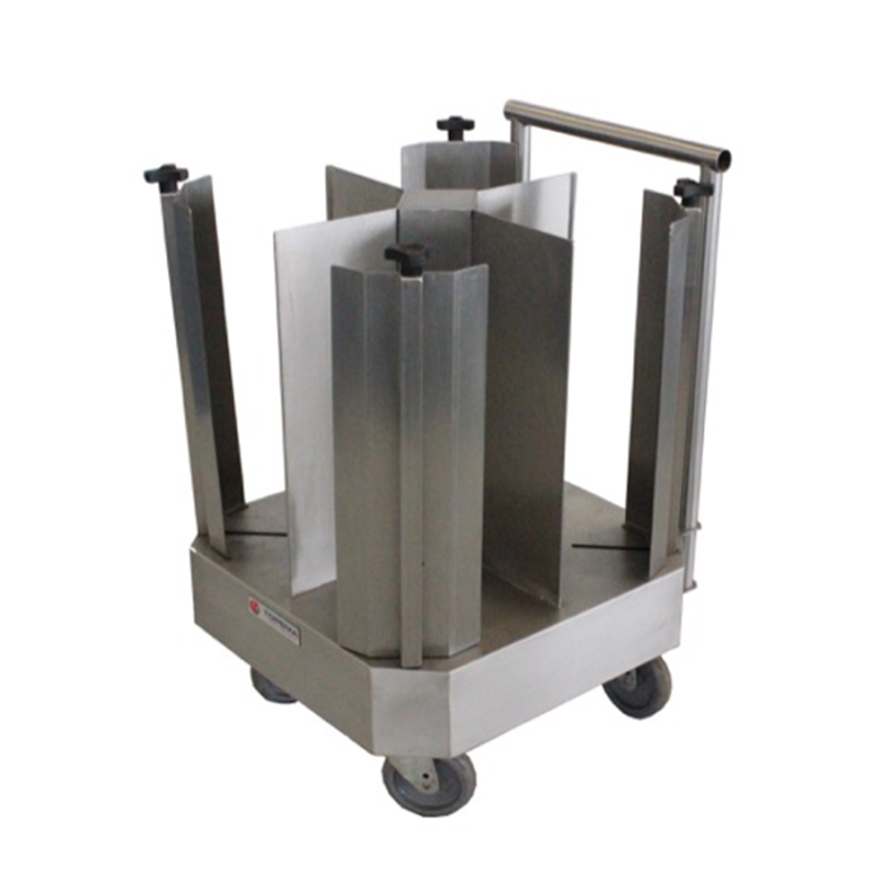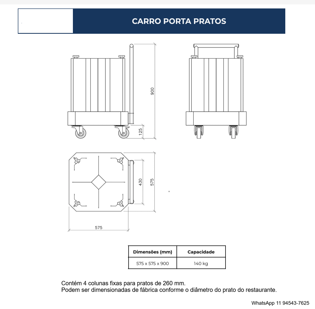 Carrinho porta pratos com colunas fixas para acondicionar, organizar e transportar pratos com segurança e praticidade em cozinhas profissionais. Fabricado em aço inox com acabamento escovado, possui 4 colunas fixas padrão para pratos de Ø 260 mm. Equipado com 4 rodízios de Ø 5”, sendo 2 fixos e 2 giratórios com freios para fácil movimentação em pisos, corredores e elevadores. Utilizado como carro para transporte de pratos nas áreas de distribuição, recolhimento, descarte e higienização, em cozinhas de restaurantes, hotéis, hospitais, churrascarias, buffet, hospitais, eventos e indústrias.