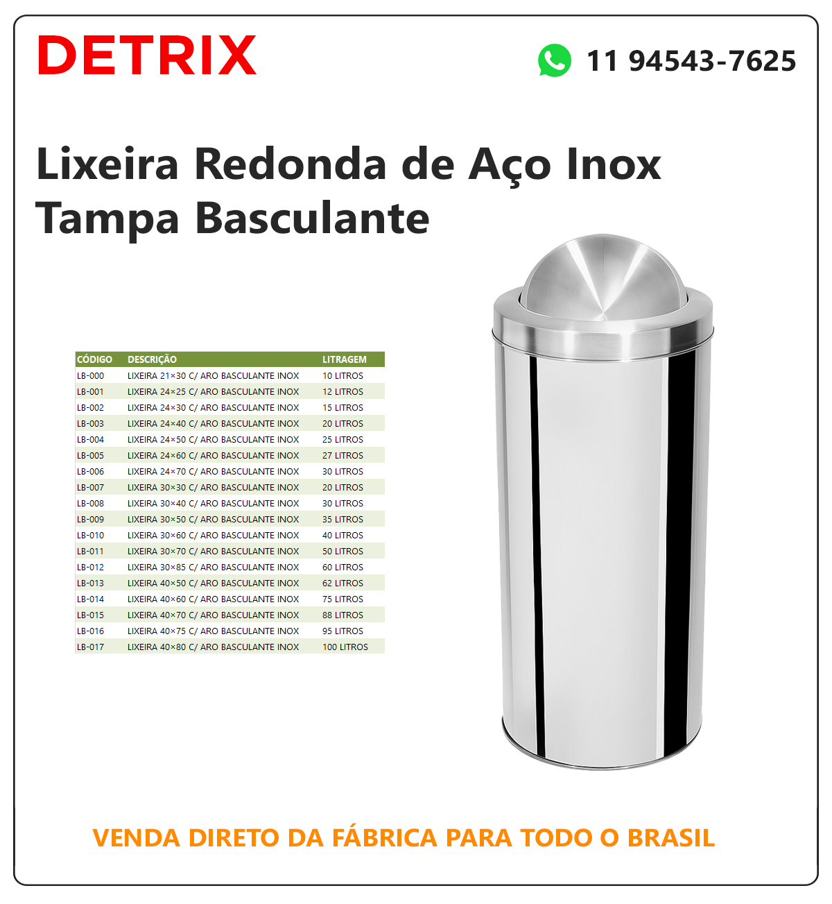 Lixeira de inox tampa basculante vai e vem, fabricada em aço inox com tampa basculante e encaixe para saco plástico; Utilizada como lixeira de inox tampa basculante e cesto de lixo de inox tampa vai vem em áreas comuns como banheiros, cozinhas, salas e escritórios, além de ambientes empresariais e locais de alta circulação, como escolas, hospitais, hotéis, restaurantes, mercados e shopping; Preço de lixeira de inox direto da fábrica.
