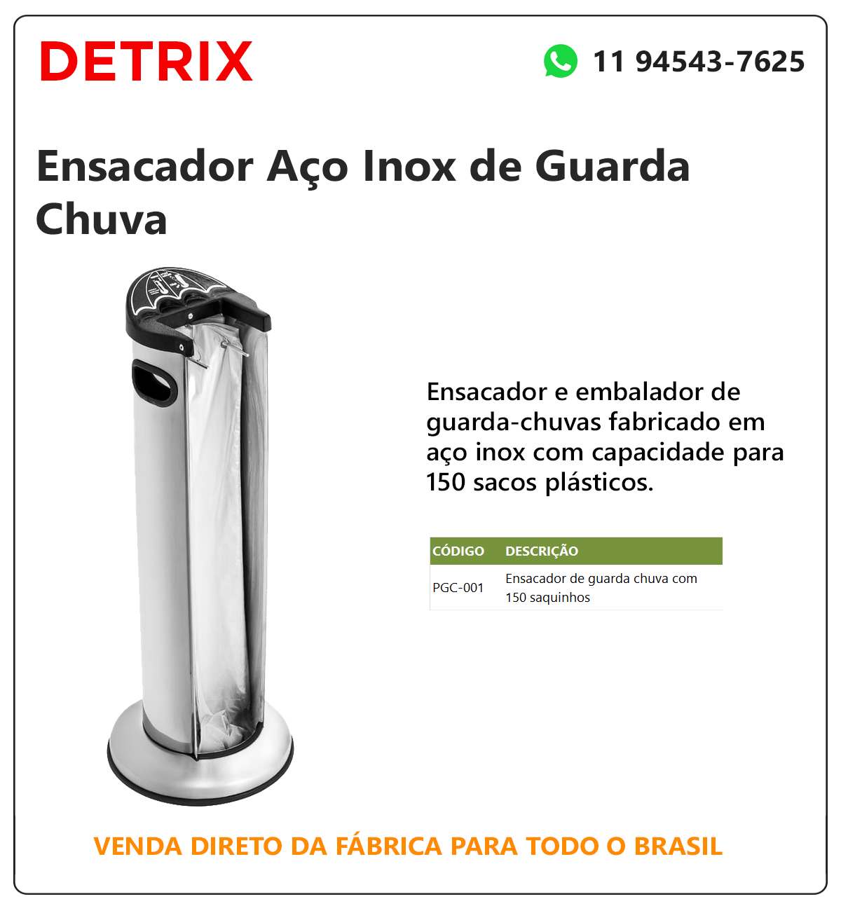Embalador de guarda chuvas, fabricado em aço inox acabamento polido, Utilizado como ensacador de guarda chuvas em recepções de escritórios, condomínios, padarias, hospitais, hotéis, restaurantes, shopping, lojas e indústrias para embalar guarda-chuvas molhados em sacos plásticos para ser transportados ou guardados em bolsas e armários evitando molhar ambientes; Preço de ensacador de guarda chuva direto da fábrica.