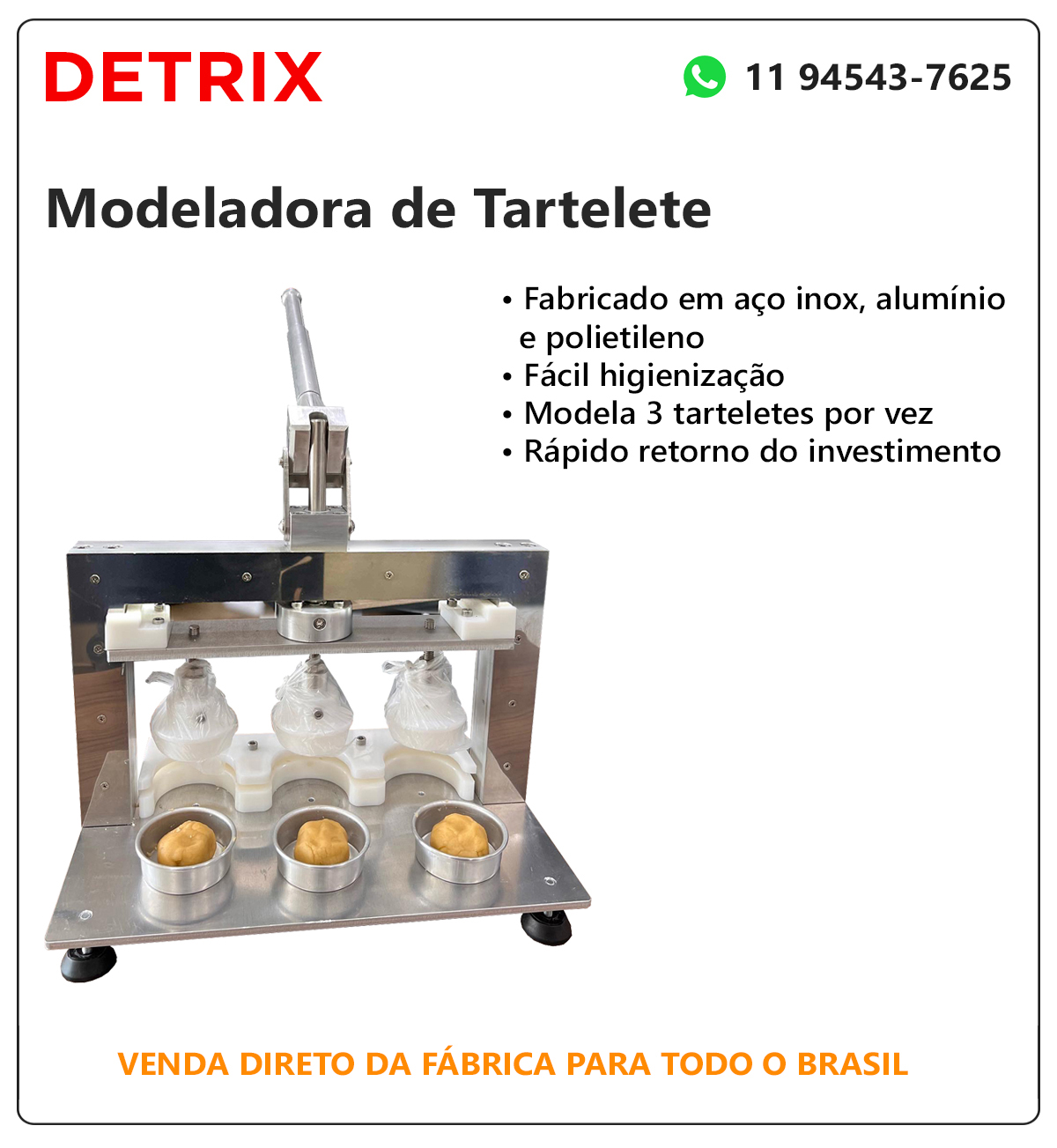 Modeladora de tartelete profissional, desenvolvida para agilizar a produção de forma rápida e uniforme, garantindo uma massa com base padronizada e consistente para tarteletes, empadas e mine tortas com recheios de carnes, queijos e recheios doces. Fabricado com estrutura em aço inox e alumínio com modeladores para formas de diâmetro 7 x altura 2,7 cm em polietileno de fácil limpeza e higienização, atendendo às exigências de boas práticas de manipulação de alimentos em confeitaria, padarias, restaurantes, lojas de conveniência, redes de fast food, buffets e cozinhas profissionais; Preço de modeladora de tartelete direto da fábrica.