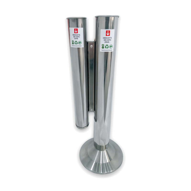 Dispenser duplo para descarte de copos plásticos de água (300 ml) e café (50 ml), fabricado em aço inox SAE 430, com estrutura tubular reforçada e base de apoio para piso. Ideal para ser utilizado próximo a máquinas de café, bebedouros ou estações de hidratação em ambientes corporativos e comerciais, como escritórios, refeitórios e praças de alimentação para descarte organizado de copos de água e café.