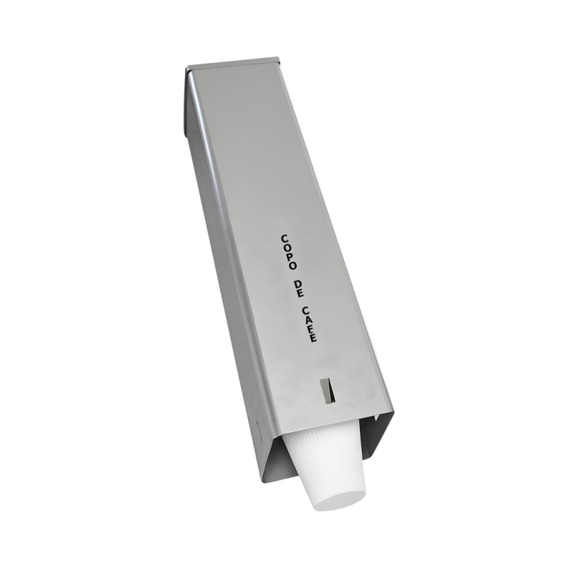 Porta copos cilíndrico para copos de café de 50 ml descartáveis, fabricado totalmente em Aço Inox SAE 430, com garras internas na base que permitem o ajuste preciso da saída dos copos plásticos descartáveis. Acompanha kit de instalação com buchas e parafusos para fixação em paredes, ideal para posicionamento próximo à máquina de café.Utilizado como dispenser porta copos para copos plásticos de 50 ml descartáveis em restaurantes, hotéis, hospitais, lojas, recepções, áreas de espera e demais ambientes com serviço de café. Preço de porta copos em aço inox direto da fábrica.