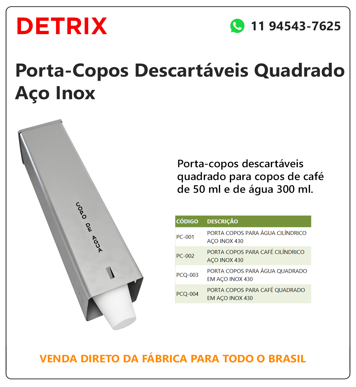 Porta copos quadrado para copos de café de 50 ml descartáveis, fabricado totalmente em Aço Inox SAE 430, com garras internas na base que permitem o ajuste preciso da saída dos copos plásticos descartáveis. Acompanha kit de instalação com buchas e parafusos para fixação em paredes, ideal para posicionamento próximo à máquina de café. Utilizado como dispenser porta copos para copos plásticos de 50 ml descartáveis em restaurantes, hotéis, hospitais, lojas, recepções, áreas de espera e demais ambientes com serviço de café. Preço de porta copos em aço inox direto da fábrica.
